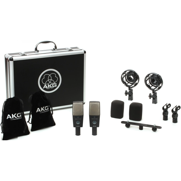 AKG C414 XLS Matched Pair – набор, включающий два конденсаторных микрофона C414 XLS, стереокронштейн H50, два эластичных подвеса типа «паук» H85, два поворотных холдера SA60, две ветрозащиты W414, таблицу с диаграммами направленности микрофона и алюминиевый транспортировочный кейс.