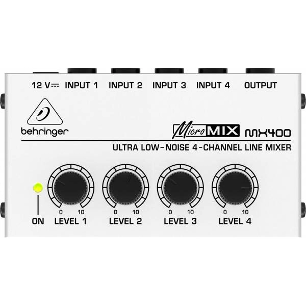 Behringer MX400 – Ультра компактный 4-канальный микшерный пульт. Создан для решения проблемы подключения нескольких микрофонов или инструментов в один канал основного микшерного пульта. Например: несколько клавишных инструментов, барабаны, группа бэк вокала, духовая группа. В микшерный пульт установлены передовые предусилители, что позволяет идеально сохранить и передать качество входящего сигнала даже очень мощного. Блок питания в комплекте.