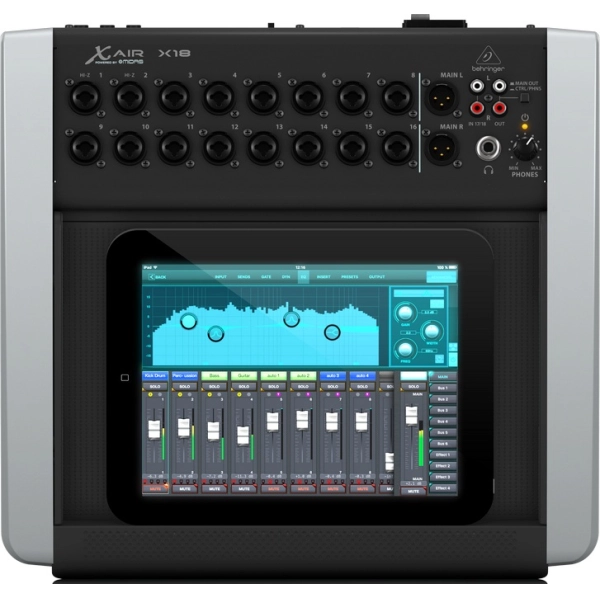 BEHRINGER X AIR X18 – настольный цифровой микшерный пульт с наличием 18 входов, 6 aux выходов, 16 фирменных преампов MIDAS и возможностью удаленного управления с помощью устройств iPad/iPhone. Микшер подходит для работы на концертах с живым звуком, а также для студийной работы.