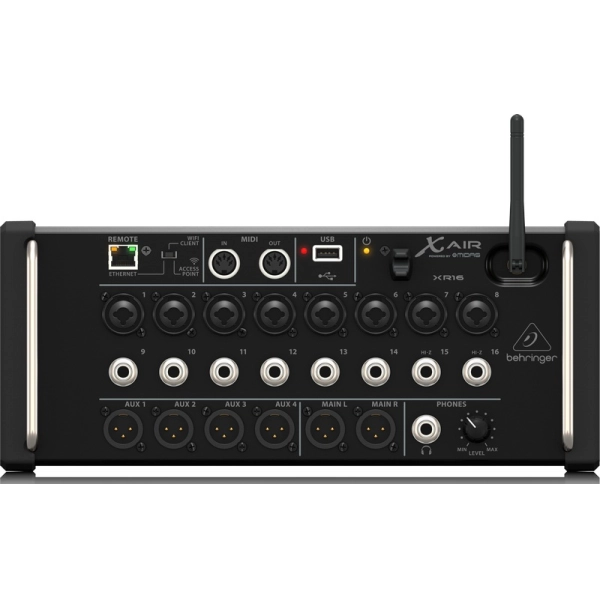 BEHRINGER X AIR XR16 – рэковый цифровой микшерный пульт с наличием 16 входов, 4 aux выходов, 8 фирменных преампов MIDAS и возможностью удаленного управления с помощью устройств iPad/iPhone. Микшер подходит для работы на концертах с живым звуком, а также для студийной работы.